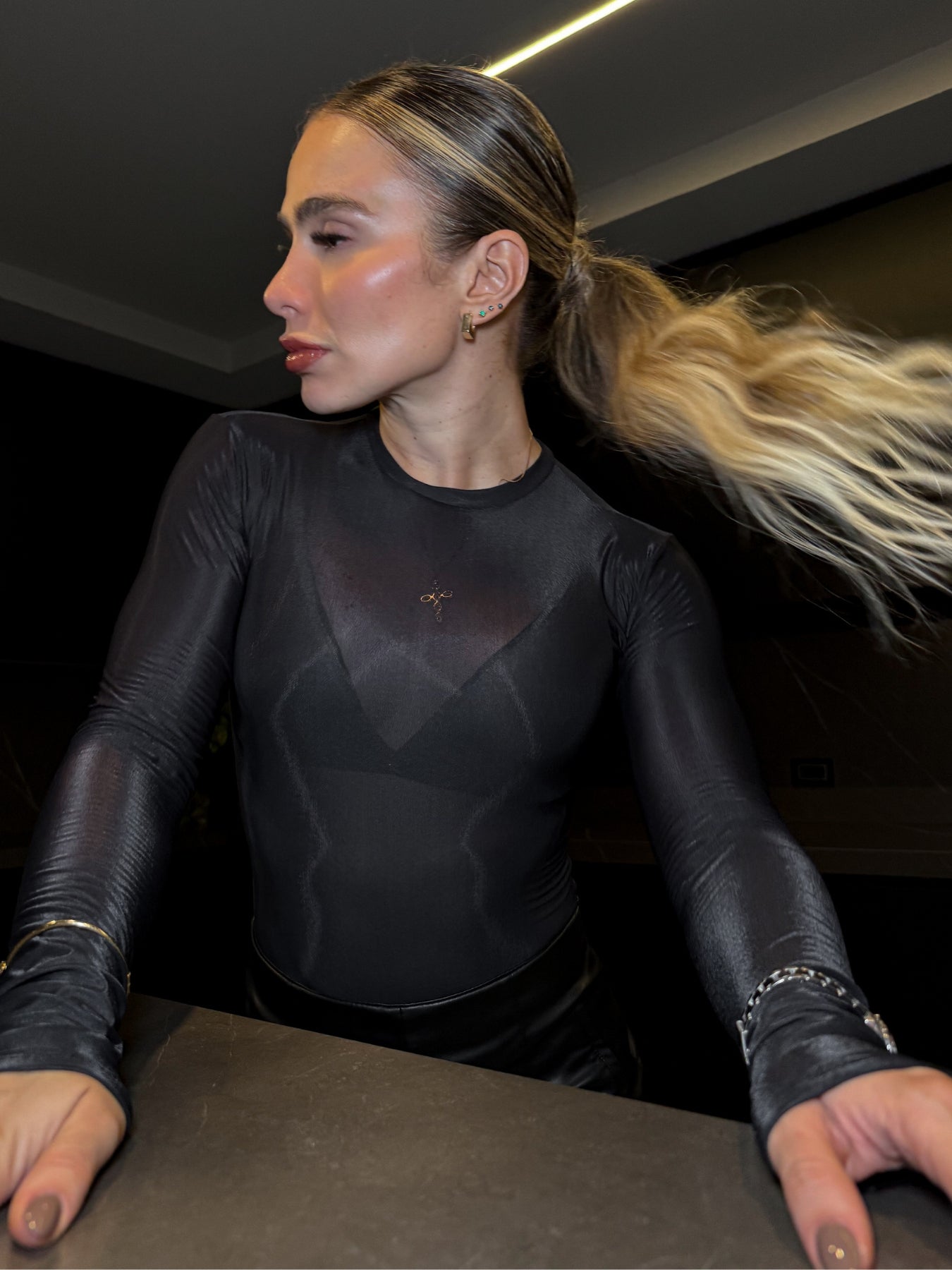 Es el clásico body manga larga cuello redondo. Está hecho en licra italiana lujosamente suave, semitransparente, codiciado por su sensación de segunda piel.