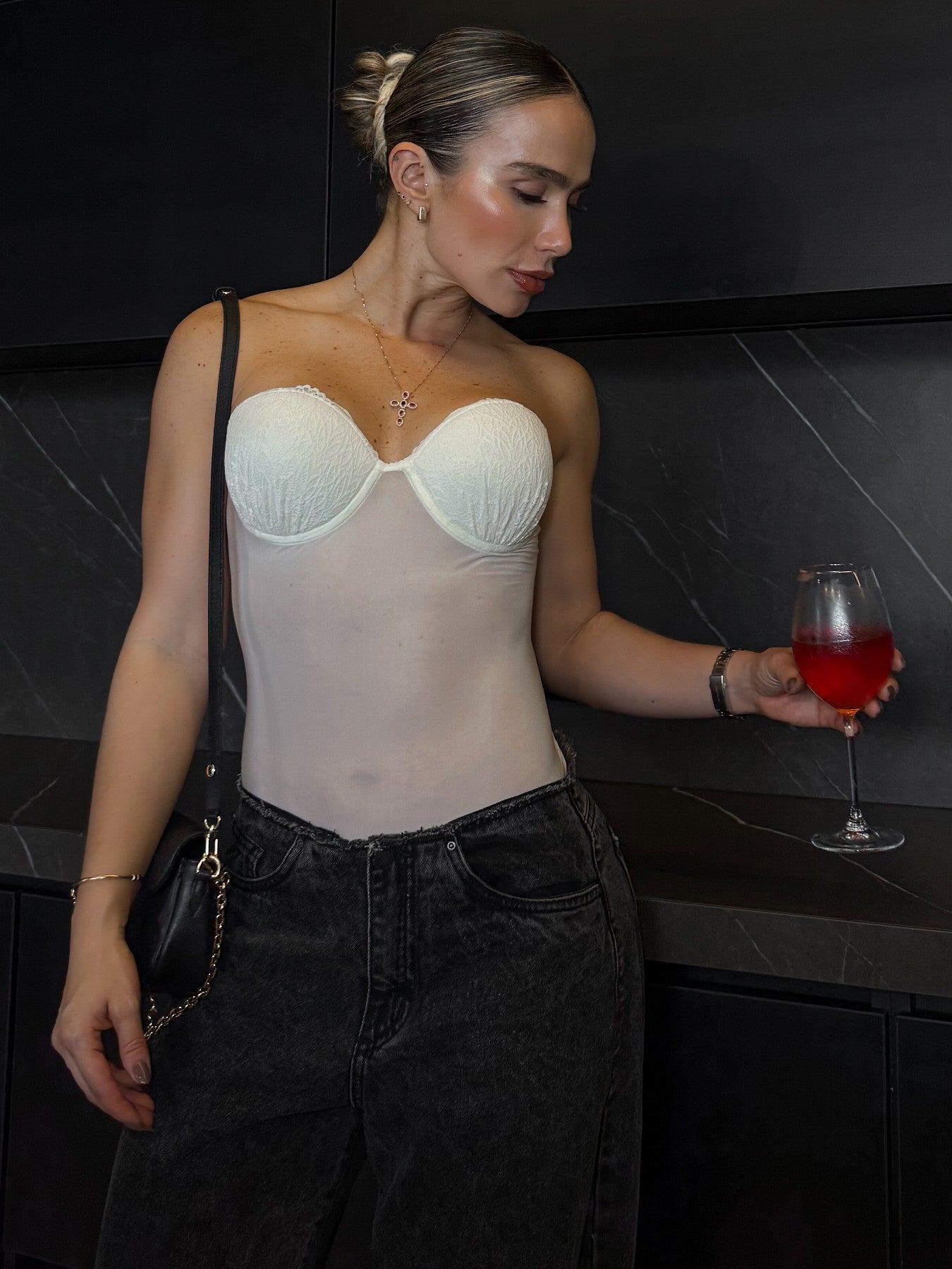 Body con copas strapless , detalle de encaje, cargaderas ajustables y removibles para un look versátil. Está hecho en licra italiana lujosamente suave, semitransparente, codiciado por su sensación de segunda piel. Nada más  romántico.